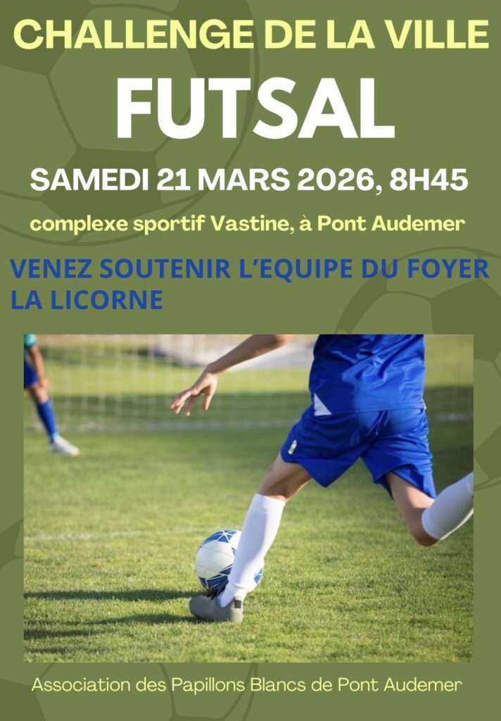 Toujours dans le cadre du Challenge de la Ville, l’équipe du Foyer La Licorne participera le 21 mars à l’épreuve de Futsal (football en salle) au complexe sportif de la Vastine à Pont-Audemer.